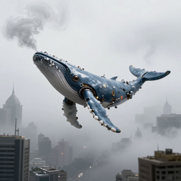 Digital artwork of a giant blue whale with mechanical parts soaring above a foggy cityscape, featuring skyscrapers and smoke.