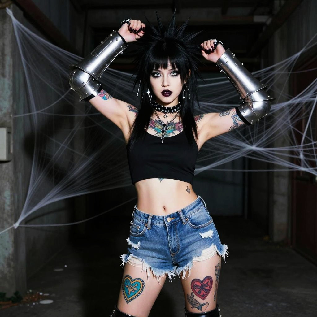 Photograph of a punk-rock, goth-inspired woman with black, spiky hair and vibrant tattoos. She's wearing a black crop top, frayed denim shorts, and shiny, metallic arm and leg armor. Her arms are raised, one hand gripping her hair, the other holding a claw-like arm guard. Her legs have colorful, heart-shaped tattoos. She's in an industrial, dimly-lit alley with web-like structures in the background.