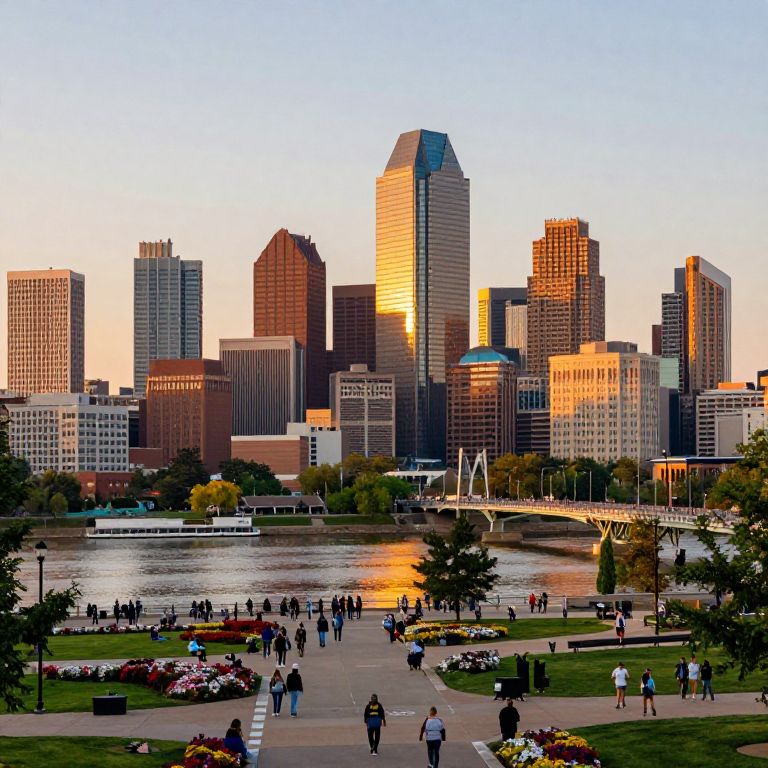 Minneapolis cityscape at sunset, towering modern skyscrapers reflecting golden light on the Mississippi River, vibrant urban parks with blooming flowers, bustling streets filled with diverse crowds, detailed architectural textures, hyper-realistic style.