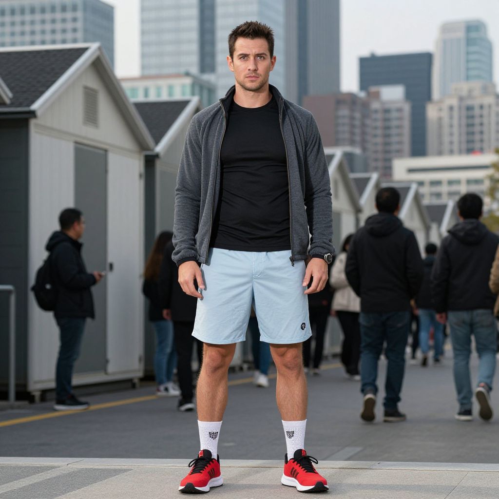 A man, lounge shorts in light blue, fitted long-sleeve tee in black, zip-up fleece jacket in gray, running shoes in red, breathable ankle socks, urban skyline, sleek modern cabins, bustling tourist crowds, camera obscura, relaxed expression, enjoying the moment.Man has masculine face and piercing eyes
