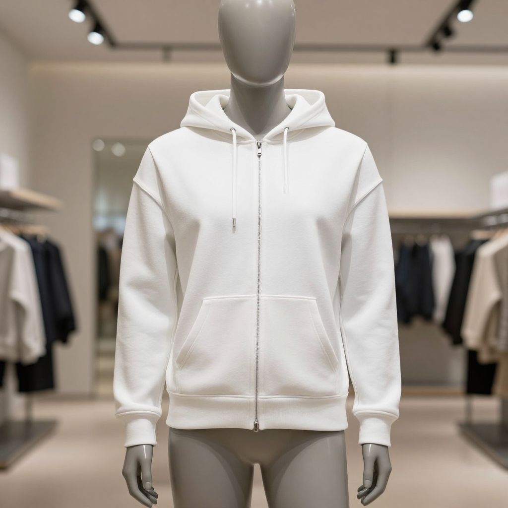 A mannequin standing upright in a modern, minimalist store setting, wearing a clean white hoodie with a zipper on the front, the hoodie slightly open to reveal the zipper detail. The mannequin has a smooth, neutral gray plastic body with subtle reflective surfaces, and its face features a simple, expressionless mask with soft, rounded features. The background is a softly lit, neutral-colored retail space with soft ambient lighting, emphasizing the clean lines and minimalist design of the outfit. The overall scene is calm, elegant, and focused on the hoodie's texture and form.