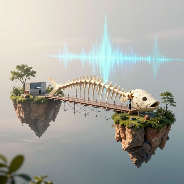 Digital artwork depicting a surreal scene: a skeletal fish skeleton bridge spans between two rocky, floating islands. A small, modern white house with a gray roof is on the left island, surrounded by green shrubs and a tree. A lone figure in dark clothing stands near the bridge's midpoint. The background features a bright, glowing blue waveform resembling a musical note. The image combines elements of fantasy and modern architecture, with a reflective water surface below the islands. The overall style is whimsical and imaginative, blending natural and surreal elements.