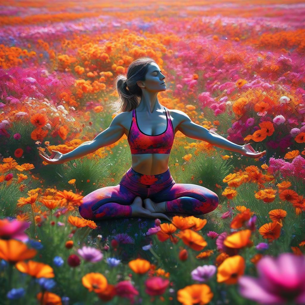 Dissolve a woman doing a yoga pose in a vibrant flower field, by David Green, #F5E1A4, #F6C1C1, fitness-themed captions, detailed and textured.