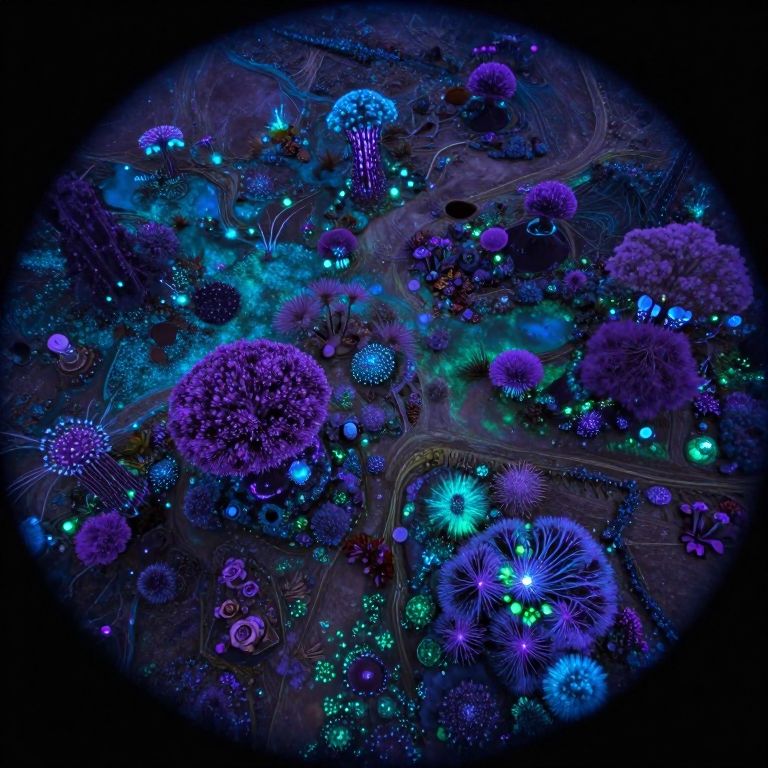 Visualize an alien landscape bathed in the enchanting glow of bioluminescent flora, with mesmerizing shades of purple, blue, and green casting an otherworldly aura across the terrain. From an unconventional aerial viewpoint, akin to a close encounter through an insect's compound eye, this scene captures the surreal beauty and intricate details of nature in another realm. The composition evokes a sense of wonder and awe, merging elements of fantastical botany with an artistic style that mirrors the dreamlike quality of Dali-esque landscapes, highlighting the textures and intricacies that define this strange yet captivating world.