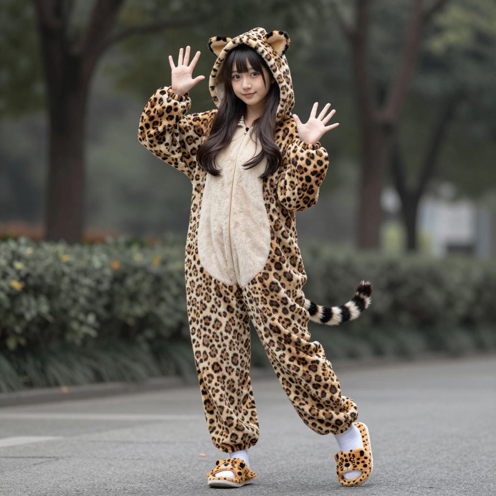 Young Woman in Leopard Print Kigurumi Costume Outdoors