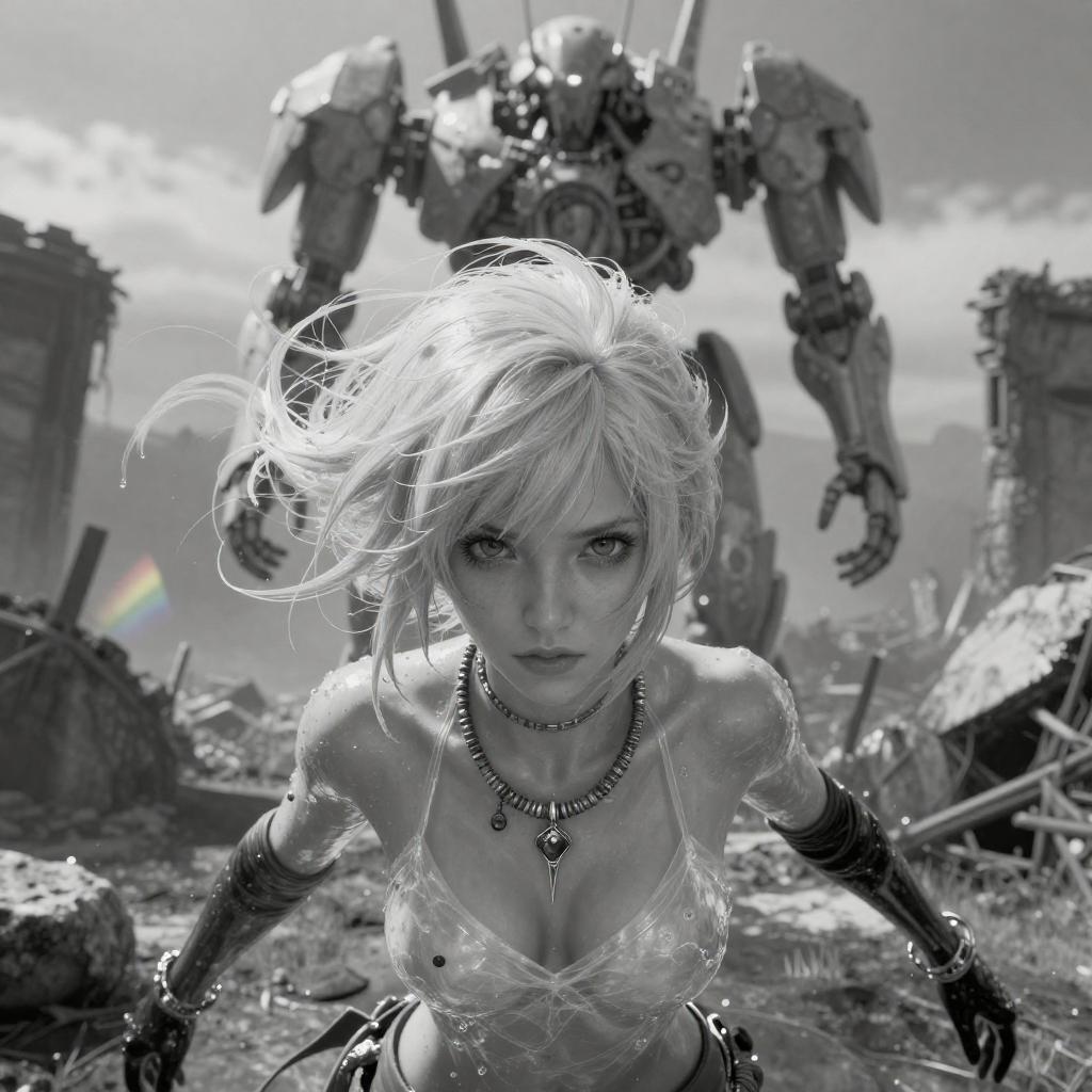 Black and white photorealistic image featuring a young woman with short white hair and detailed eyes wearing transparent clothing and black elbow gloves, standing in front of a large mech robot amidst post-apocalyptic ruins. The scene includes volumetric lighting, detailed water droplets, and a faint rainbow in the background, conveying a dramatic and intense atmosphere.
