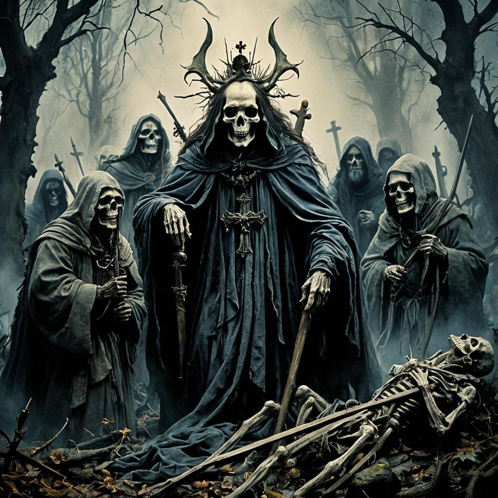 Black-and-white dark fantasy illustration featuring a plague herald clad in medieval armor and a hood, seated on an ornate throne adorned with spikes and skulls. Surrounded by numerous skulls and ominous towering skull figures wearing crowns or spikes, set in a gothic, atmospheric environment with a void-like background evoking despair and darkness.