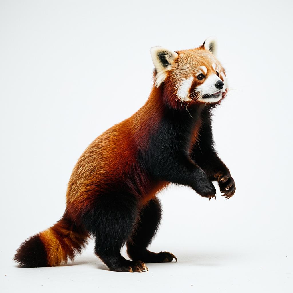 A full-body, side-view shot of a red panda, on a white background, cinematic lighting, natural kodak-film tone, hyper-realistic details, vibrant and beautifully color-coded