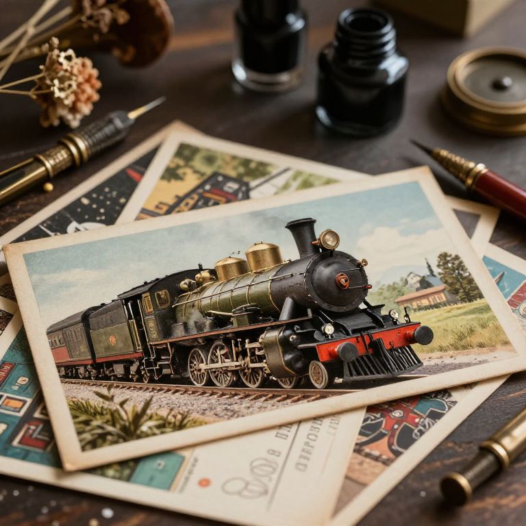 Close-up of a vintage postcard featuring an old-fashioned steam train, placed on a cluttered desk with antique writing tools, ink bottles and dried flowers, moody lighting, intricate details, evoking a sense of journey and history through postcards
