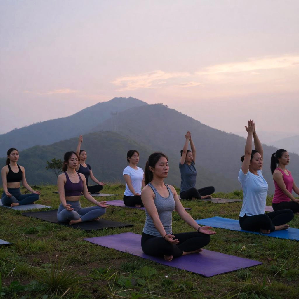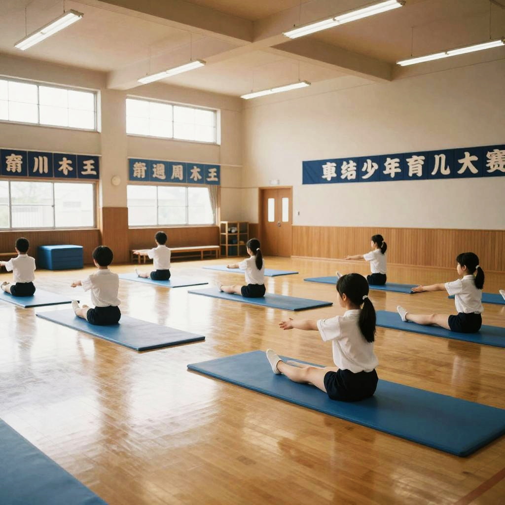 Japanese school gym filled with natural light, polished wooden floors, students practicing gymnastics in uniform, traditional banners hanging, serene and disciplined atmosphere, high resolution