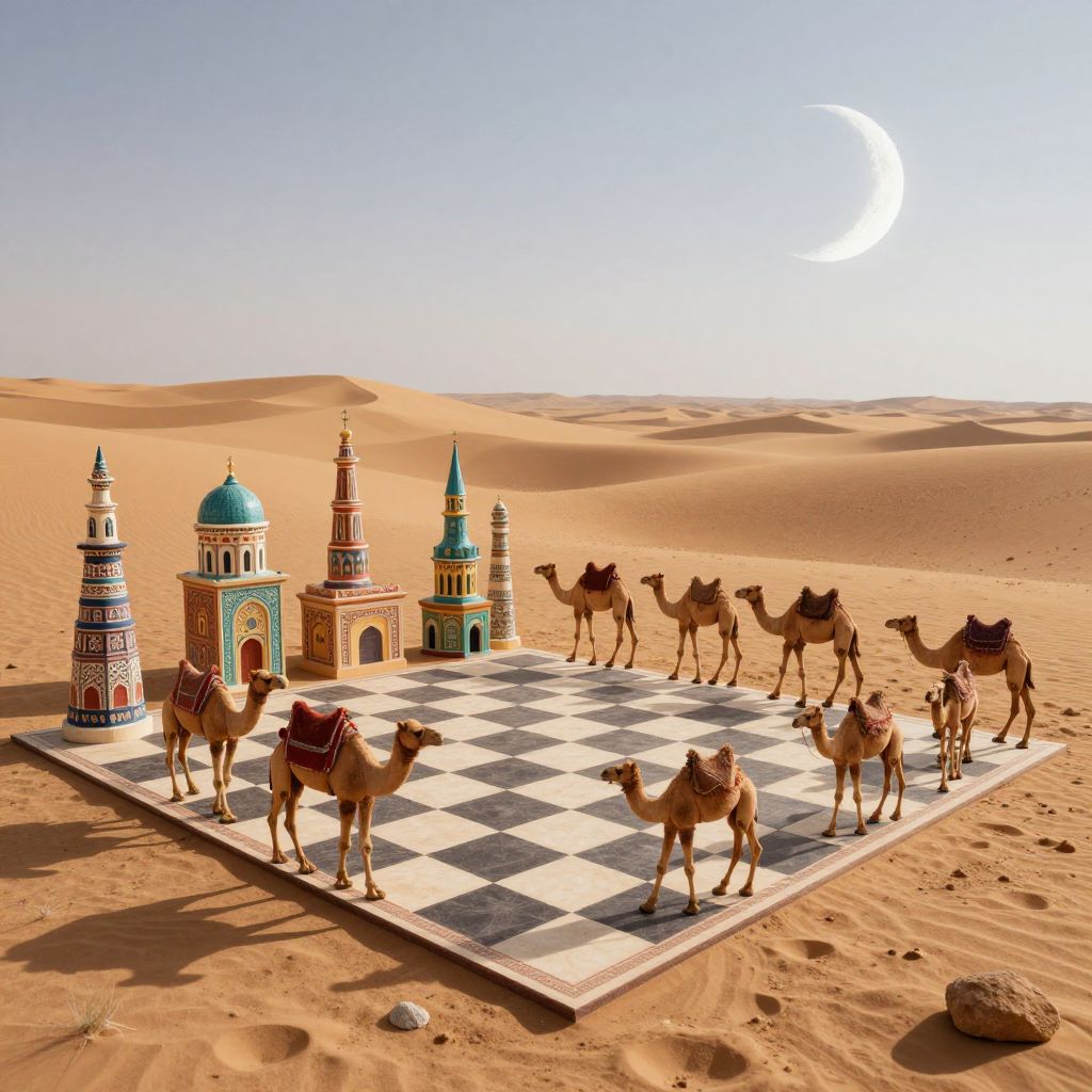 Photograph of a chessboard in a desert with colorful minarets, camels standing on squares, and a crescent moon in a clear sky