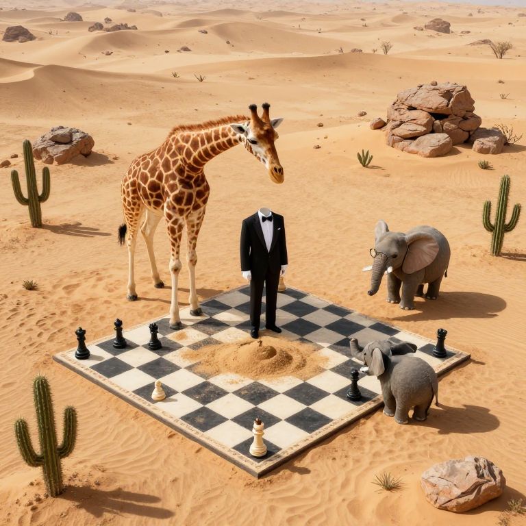 Imagine an expansive desert chessboard, where each piece transforms into grandiose architectural marvels under the soft light of a crescent moon. The structures stand tall, their intricate details and vibrant colors painting a surreal landscape. Amidst this fantastical scene, a procession of camels moves silently across the board, their shadows weaving an unexpected harmony in the absurd yet captivating tableau. This vision evokes a range of emotions from curiosity to awe, masterfully blending the simplicity of nature with the ingenuity of human design.