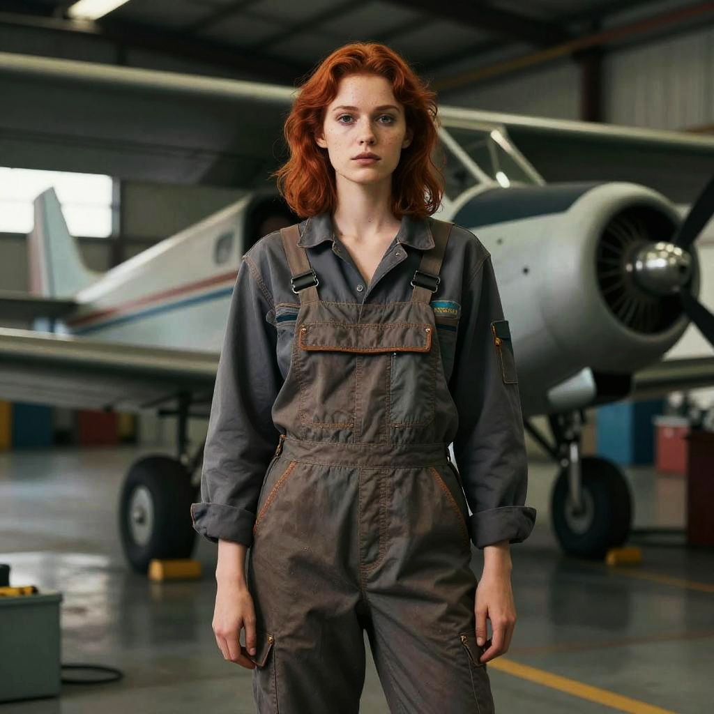 Photograph of a young white woman with wavy red hair standing in an aircraft hangar. She wears a dark gray, slightly worn, denim overall with rolled-up sleeves and a small patch on the left chest. Behind her, a silver and white small propeller airplane is parked. The hangar has a high ceiling with visible beams and fluorescent lights. The floor is gray with yellow lines marking the parking area. The woman's expression is serious, and she stands centered in the frame, looking directly at the camera. The overall texture of the image is sharp and detailed.