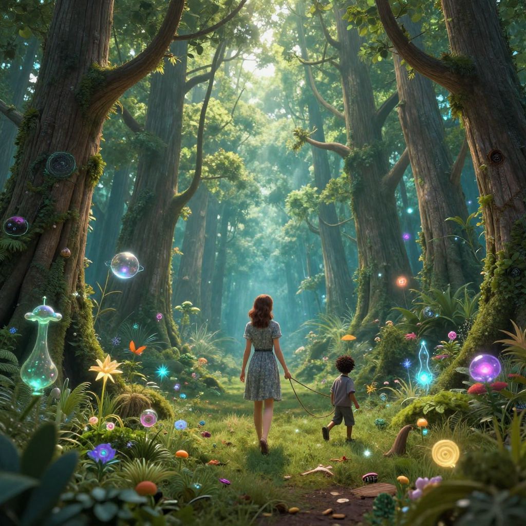 Digital illustration of a magical forest scene: a young woman with brown hair in a white dress walks hand-in-hand with a small boy wearing a striped shirt and shorts. They stand on a sunlit path flanked by towering trees adorned with green moss and glowing fairy lights. Colorful, luminescent flowers and floating bubbles surround them, and sunlight filters through the dense canopy, creating a dreamy, ethereal atmosphere. The forest floor is lush with greenery, and the background fades into a misty, enchanted woods. The image exudes a whimsical, fairy-tale-like quality.