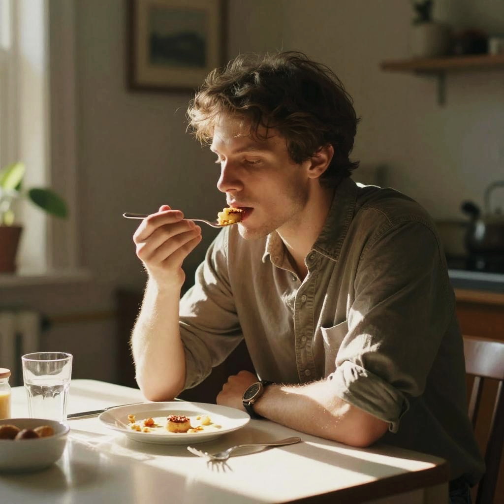 An artistic image showcasing a man seated at a table bathed in warm sunlight, thoughtfully eating, surrounded by the calm of a subtly decorated room.