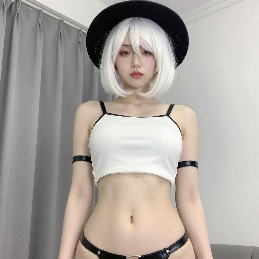 Photograph of a woman with white hair, black hat, and white crop top, viewed from a low angle. She wears black garter straps, black gloves, and a thong, exposing her buttocks. The background shows a ceiling with fluorescent lights and red pipes. Her gaze is directed downward.