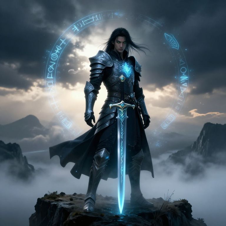 Fantasy character design male standing on a misty cliff edge with intricate armor glowing faintly blue, long flowing dark hair, piercing emerald eyes, wielding an ancient sword, surrounded by ethereal floating runes, dawn light breaking through dark storm clouds, detailed cinematic style