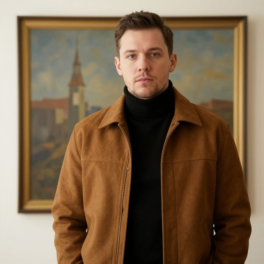 Photograph of a white man with short dark brown hair and blue eyes, standing indoors. He wears a brown suede jacket over a black turtleneck. His expression is neutral, and he gazes directly at the camera. Behind him is a framed painting of a European town with a church steeple, slightly blurred to keep focus on him. The background wall is white, and the painting has a gold frame. The lighting is even, highlighting his facial features and the texture of his jacket.
