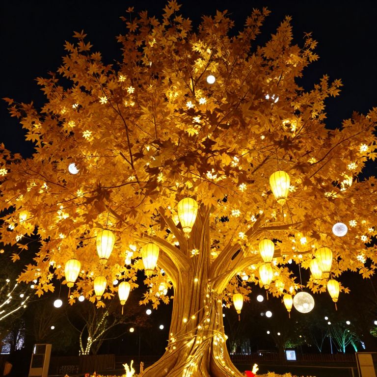 Luminous lanterns dangle gracefully from a majestic golden tree, its branches adorned with vibrant autumn leaves and surrounded by floating orbs of light, creating a magical scene where nature and artistry intertwine.