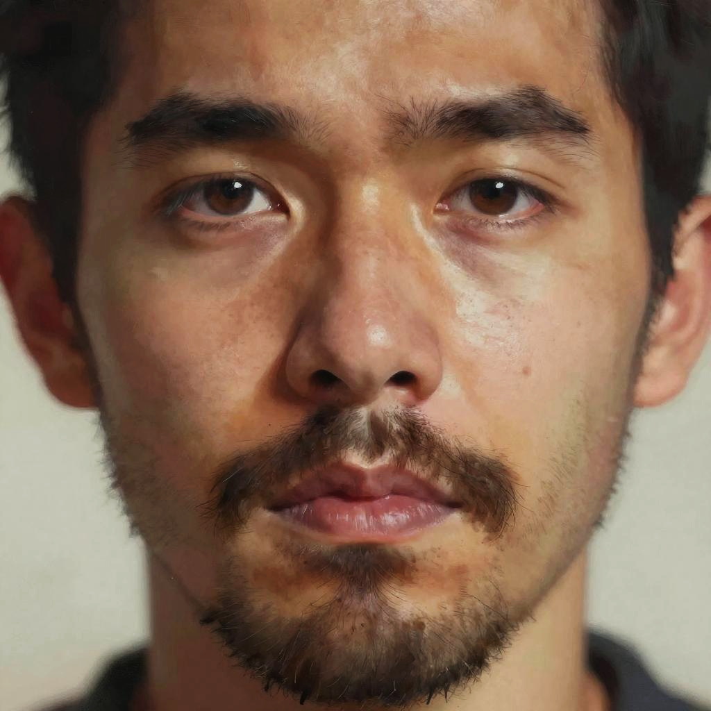 Ugly facial hair close-up portrait of a character with patchy beard, uneven growth, and wild mustache, surreal lighting, expressive eyes, textured skin, digital painting