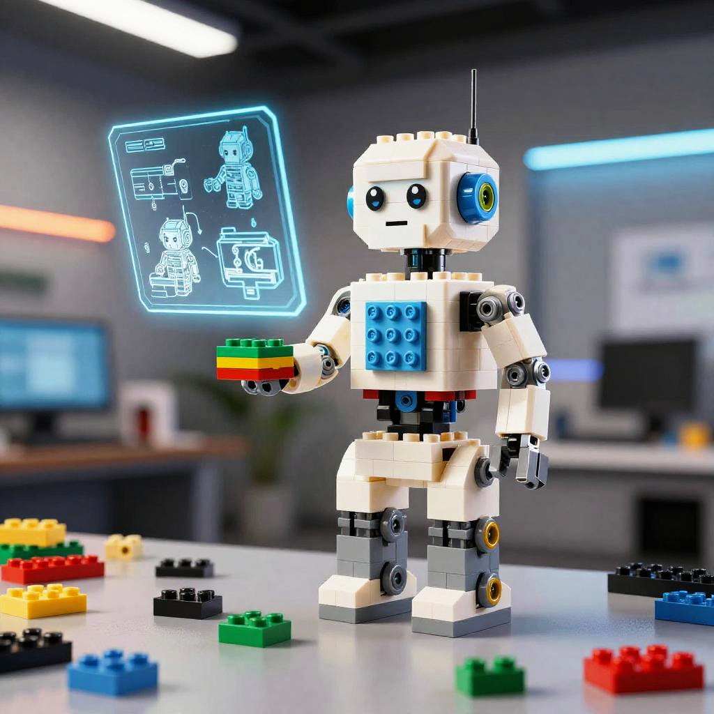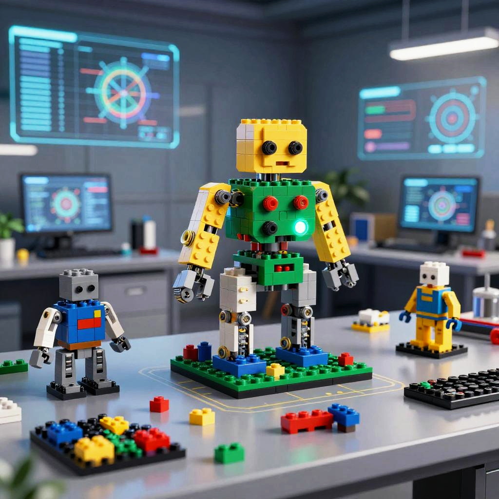 This is a collage of four colorful, highly detailed, pixelated LEGO dioramas. Each scene features a mix of LEGO robots and characters in various sci-fi and fantasy settings. The top left has a neon green robot and pumpkin, the top right shows a white, arch-like structure with orange and green figures. Bottom left has a grey, spaceship-like robot, and bottom right features a skull-headed robot with colorful accessories. The background is mostly dark, making the vibrant LEGO pieces pop.