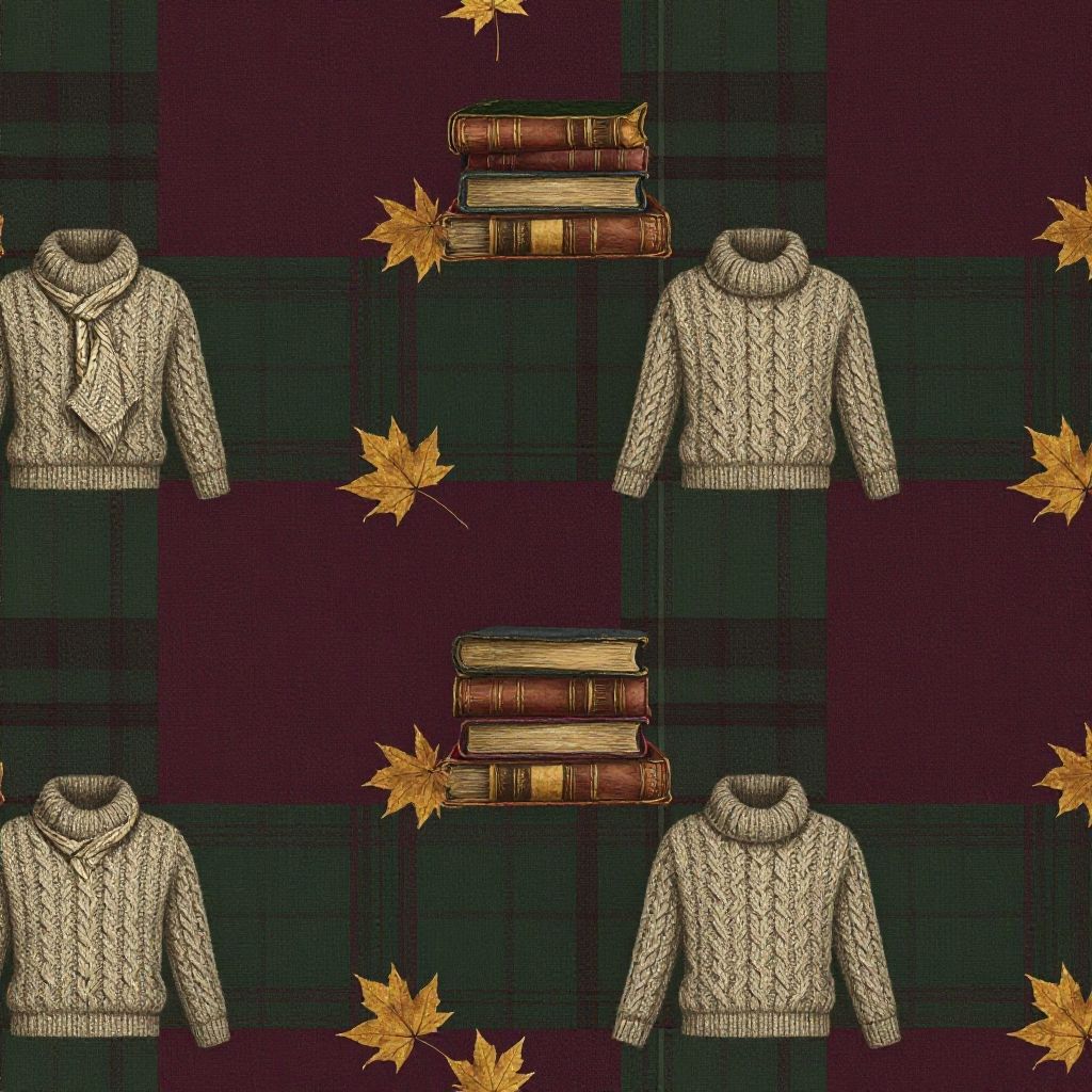 Digital pattern featuring beige, knitted sweaters with turtleneck, stacked books with yellow pages, and scattered autumn leaves on dark plaid background.