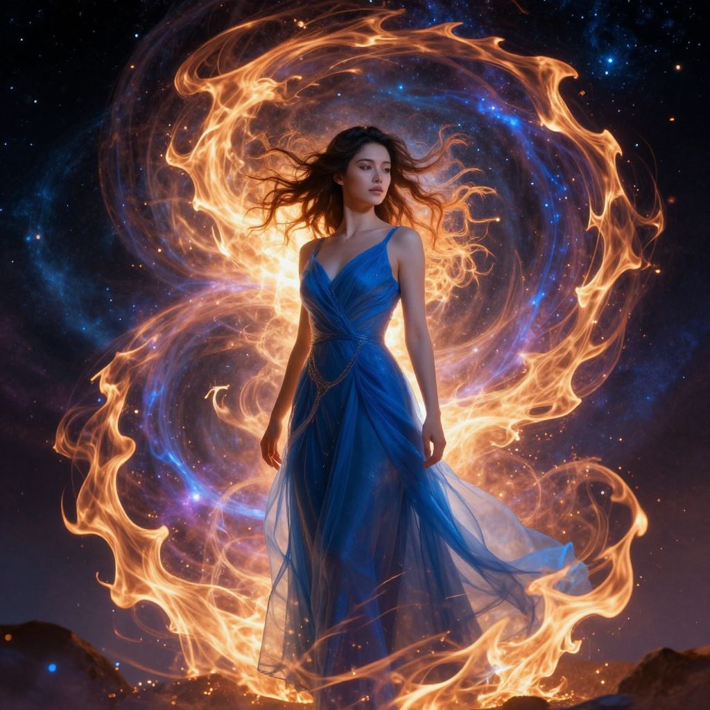 A woman in ethereal blue attire stands against a swirling backdrop of celestial fire and cosmic light, her flowing hair merging with the radiant, otherworldly flames that defy the boundaries of reality.