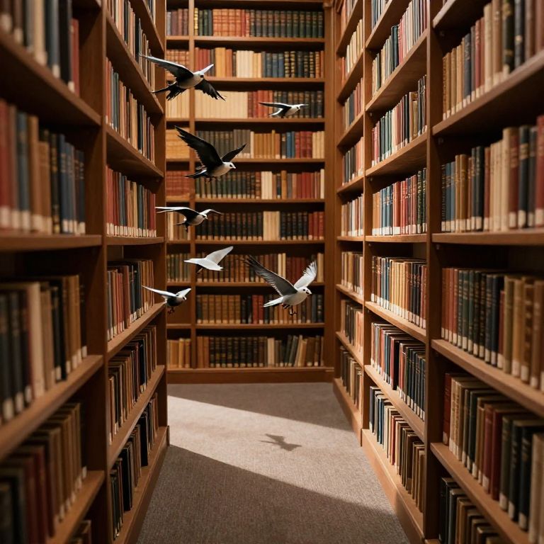 Sunlit shelves flank a quiet aisle as seven birds glide gracefully between rows of ancient tomes, casting soft shadows on the carpeted floor beneath.