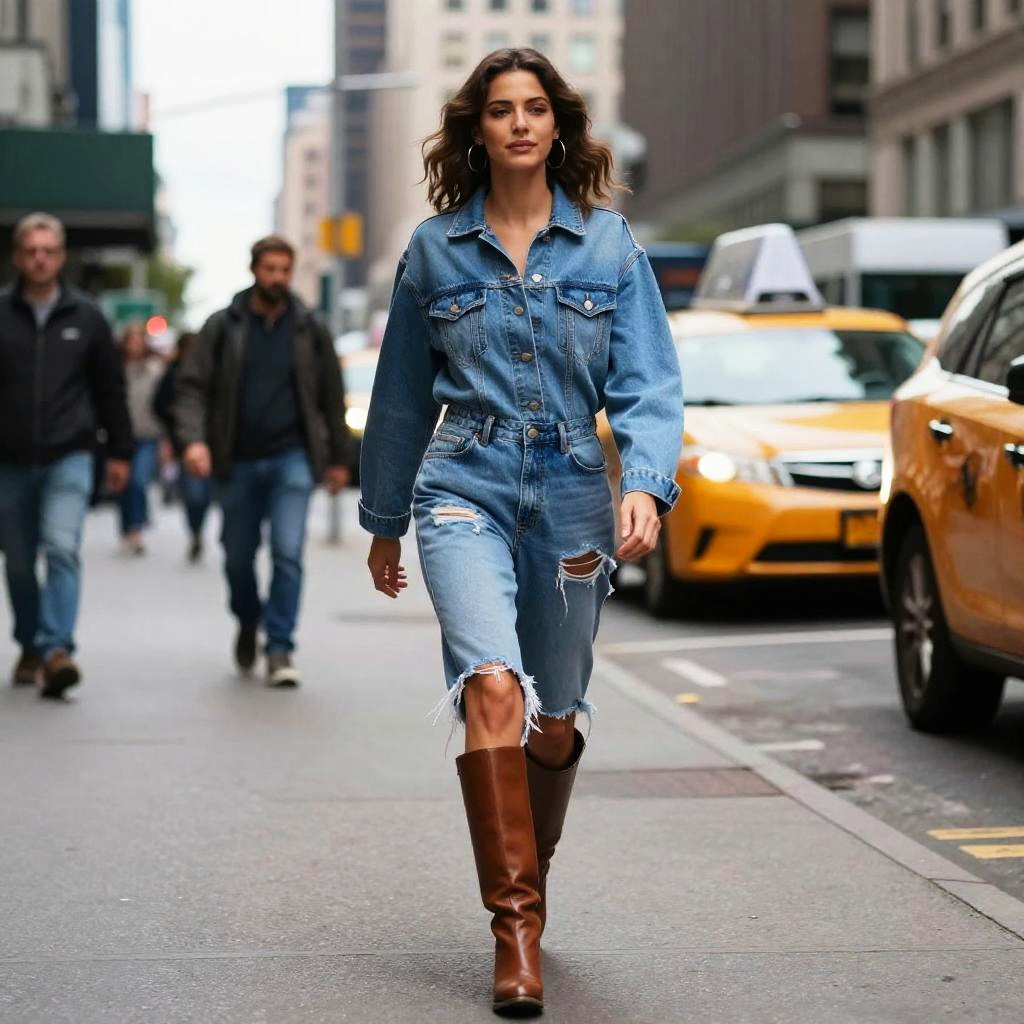Photograph of a confident woman with long, wavy blonde hair, holding a black umbrella in a rainy city street. She's wearing a black leather jacket, black shorts, and knee-high black boots. The street is wet with reflections of city lights, and blurred figures and cars are in the background. She walks straight ahead, looking directly at the camera.