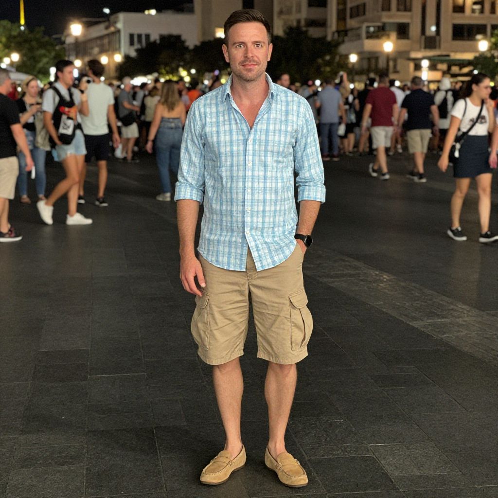A man, light blue plaid button-up shirt, khaki cargo shorts, tan suede loafers, laid-back weekend style, urban plaza, bustling crowds, night-time glow, casual smile, relaxed demeanor, cameraphone style. Man has masculine face and piercing eyes