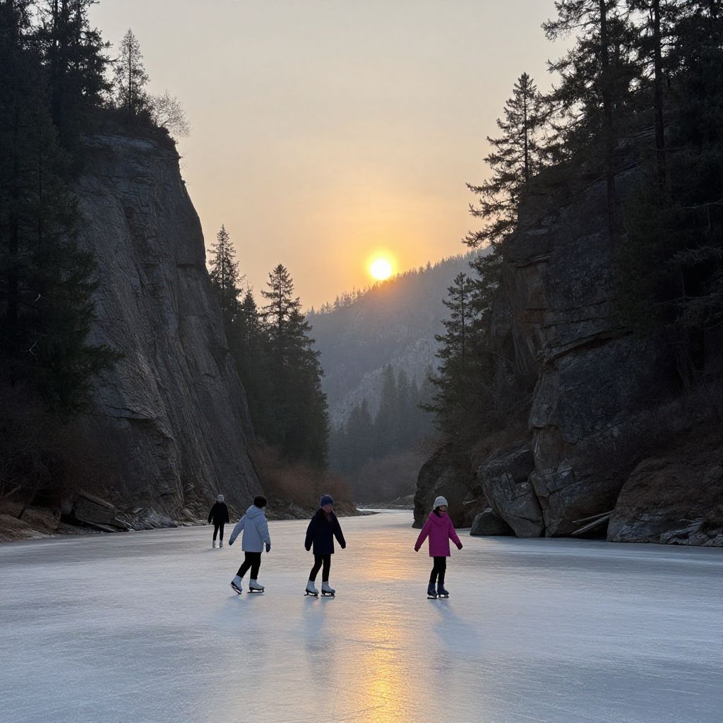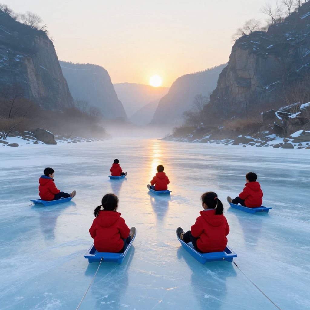 Children glide across a serene, icy expanse in a digital art rendering, their vibrant red jackets contrasting against the tranquil blue hues of the frozen river, as a golden sun casts a dreamlike glow over the misty canyon landscape.
