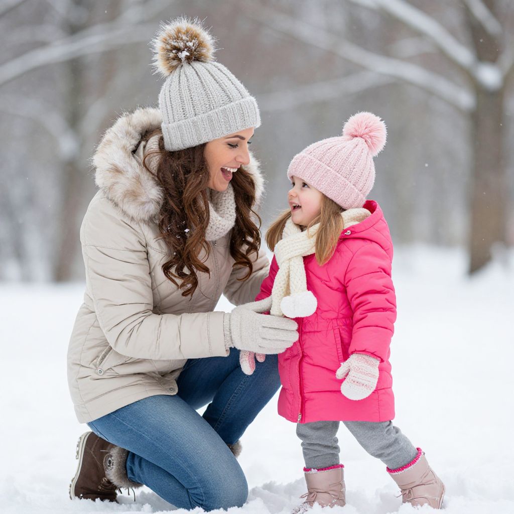 Photograph of a smiling mother and daughter in winter clothes, standing in a snowy park with trees, both wearing white knit hats.