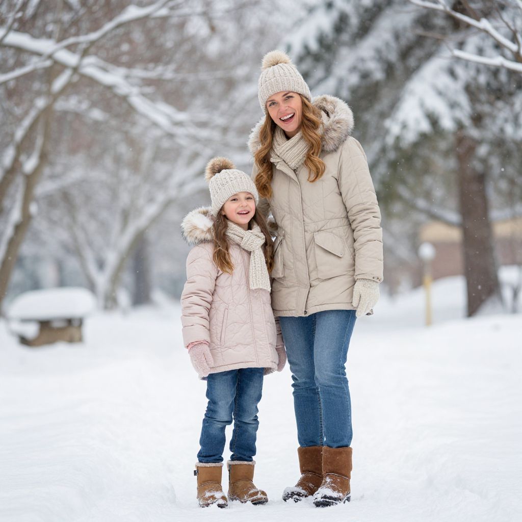 Photograph of a smiling blonde woman and young girl standing in a snowy, wintry park. Both wear beige knit hats with pom-poms, beige winter coats with fur-trimmed hoods, pink and beige scarves, and brown boots. The woman has long hair and is taller, with her arm around the girl's shoulders. The background features snow-covered trees and blurred park scenery. The image is brightly lit with overcast, snowy weather, capturing a joyful winter moment.