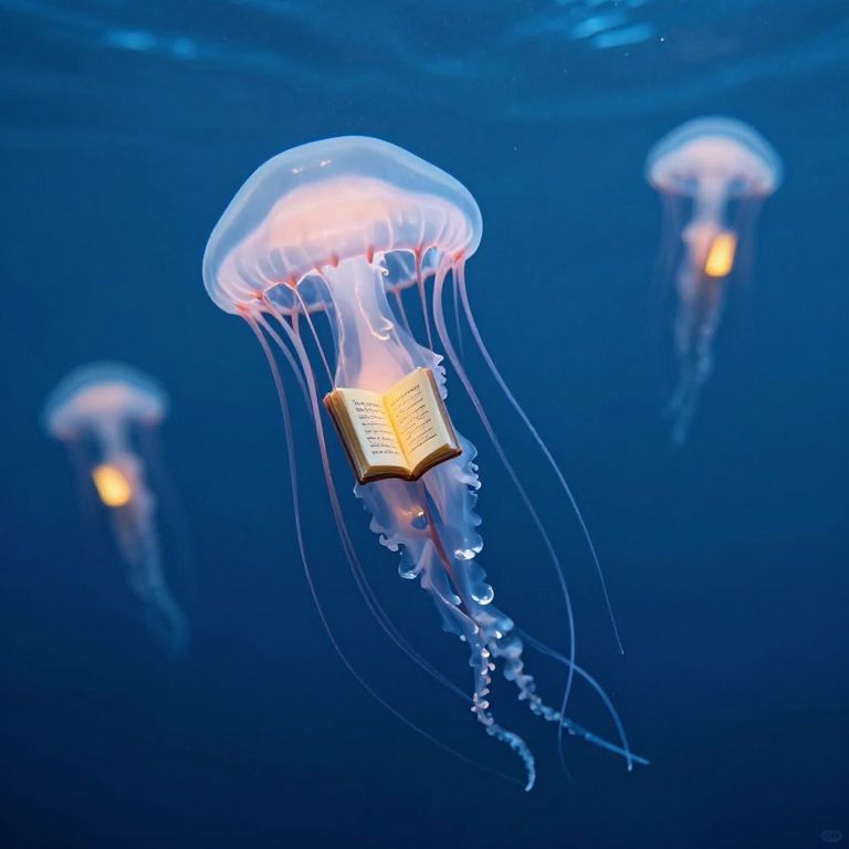 Beneath the ocean’s surface, jellyfish float with tiny books clamped between their tentacles, each glowing with the final thoughts of lost sailors.