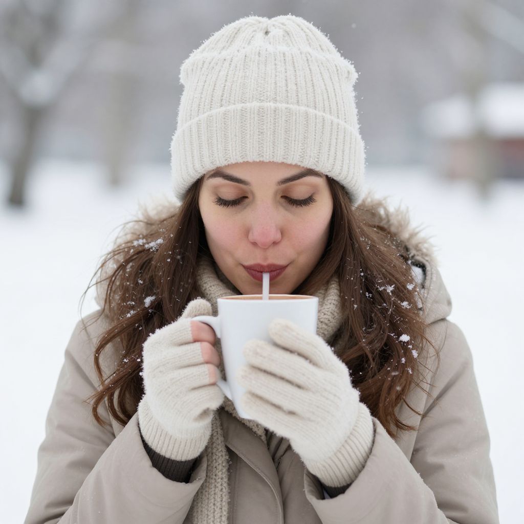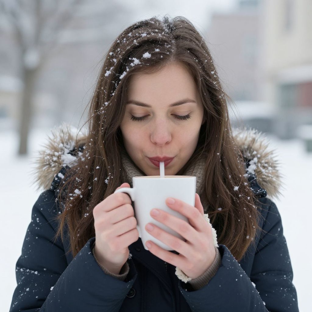 Photograph of a young Caucasian woman with fair skin and long brown hair, wearing a black winter coat with a fur-lined hood, standing outdoors in a snowy environment. She is holding a white mug with a straw in her right hand, bringing it to her lips to sip. Snowflakes are visible on her hair and coat. Her eyes are closed, and she has a content expression. The background is blurred, showing a snowy street with trees and buildings. The overall color palette is white, black, and brown, with a soft, overcast light.