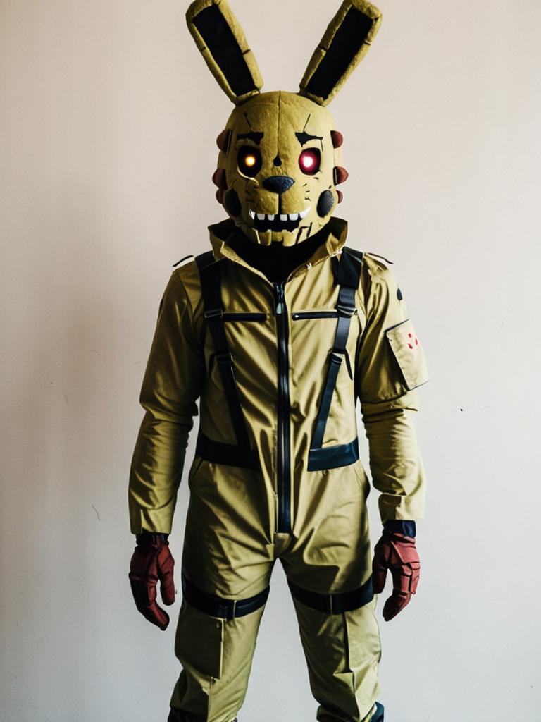 Portrait of a person wearing a detailed and realistic Springtrap costume from the Five Nights at Freddy's franchise. The costume includes a yellowish-green full-body suit with black straps and red gloves, complemented by an animatronic rabbit head mask with glowing eyes. The background is plain, highlighting the intricacy of the cosplay outfit.