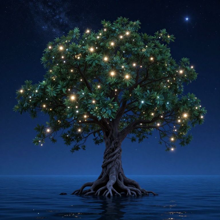 Photograph-style digital illustration of a solitary tree with dense, dark green leaves, standing in calm, reflective water under a starry night sky. The tree is adorned with glowing, white and yellow fairy lights scattered among its branches, creating a magical atmosphere. The tree's thick, gnarled roots are partially submerged in the water. The sky transitions from deep blue at the top to lighter blue near the horizon, with scattered stars adding to the serene, enchanting scene. The overall composition is balanced and evokes a sense of tranquility and wonder.