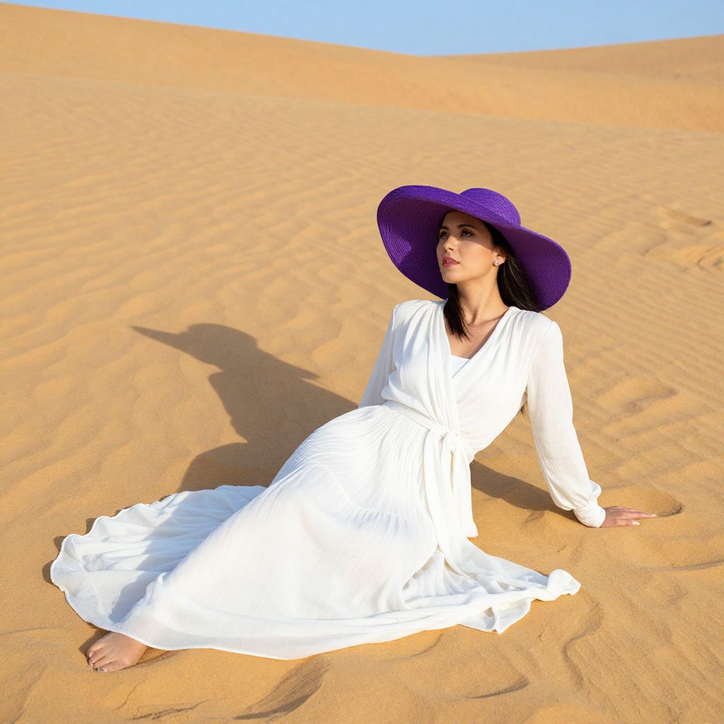 Woman seated gracefully on a golden sand dune, donning a flowing white ensemble paired with a vibrant purple wide-brimmed hat, her shadow cast sharply against the sunlit beach backdrop.