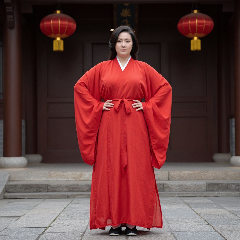 Plus Size Wanda Costume, woman in red robe standing in front of a building with a red lantern