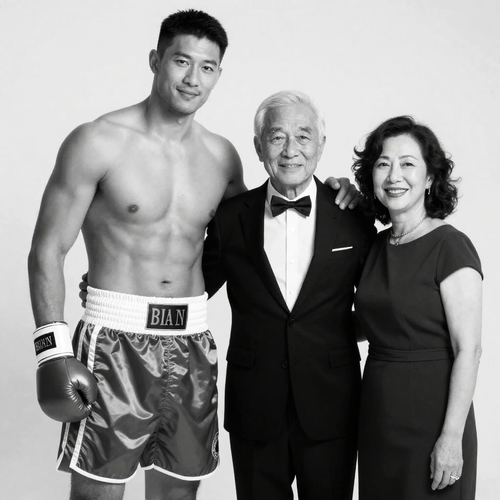Black and white photograph of three people. A tall, muscular man in shiny boxing shorts stands left, arm around a shorter, older man in a black suit and bow tie, who has one arm around a smiling woman in a dark dress. The man in boxing shorts has short, dark hair and a slight smile. The woman has curly, shoulder-length hair and a choker necklace. All three are standing close together against a plain background.