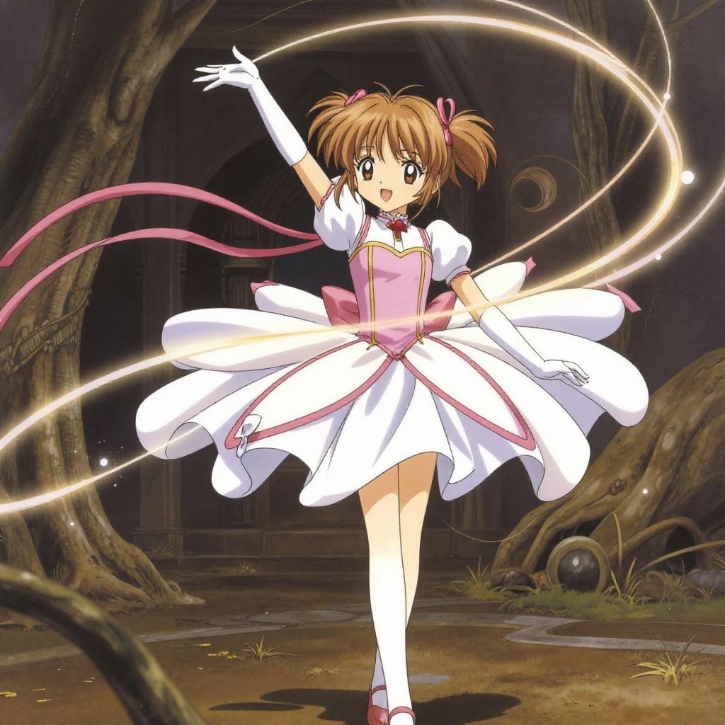 Madoka Magica art style featuring a whimsical magical girl in flowing costume, graceful pose with dynamic ribbons and light trails, detailed environment blending fantasy and surrealism, warm but muted colors, soft shadows and highlights enhancing the mood