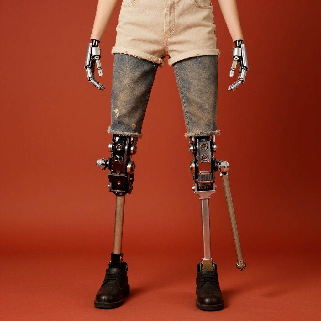 Photograph of a mannequin with prosthetic legs, wearing denim shorts, black boots, metallic gloves, and black mechanical leg braces, against a
