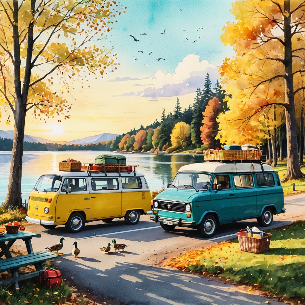Two live cars on the street in front of idyllic lakeside road, bright yellow camper van with a sunrise hat and holding a fishing rod, teal hatchback car wearing a scarf and carrying a picnic basket, calm lake with trees, ducks, a small pier and colorful autumn leaves, watercolor painting style.