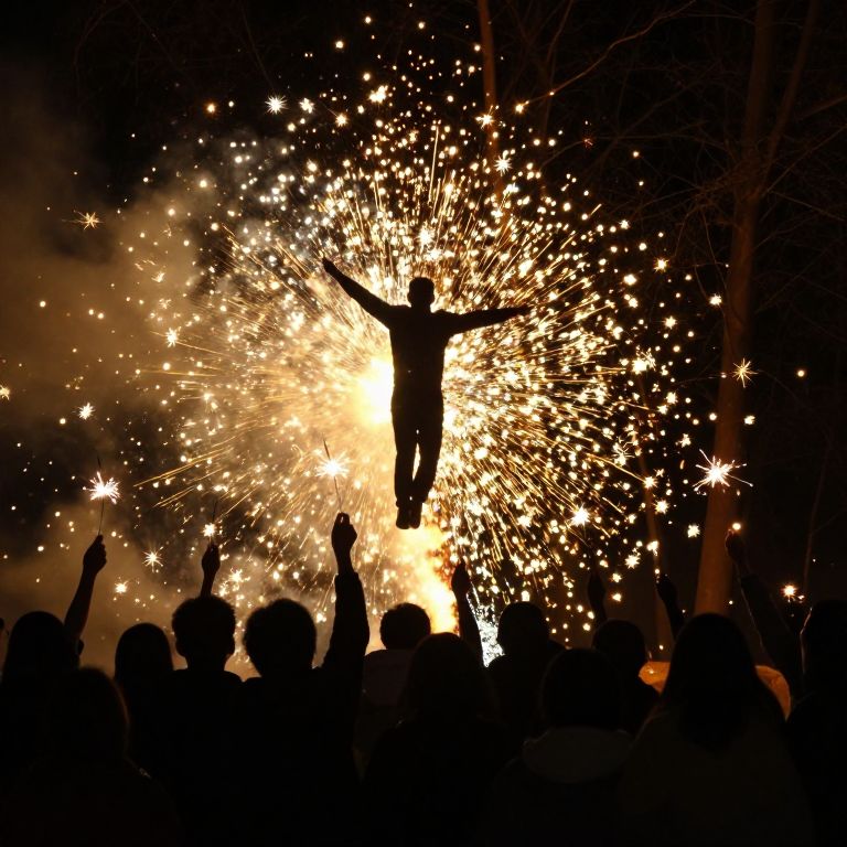Silhouetted against a radiant backdrop of golden sparks, a floating figure commands attention as it hovers gracefully above a crowd of captivated onlookers, who hold flickering sparklers aloft in a forested clearing.