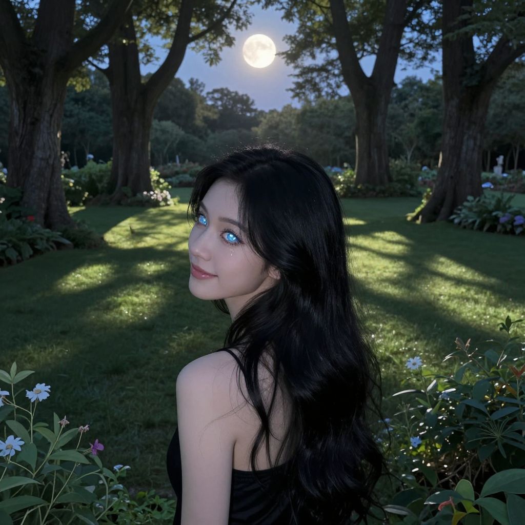 A digital art composition depicting an enigmatic character with lustrous black hair draping elegantly down their back stands in a tranquil garden under the twilight hour. The scene is gently lit by the soft glow of the moon peeking through towering trees, creating intricate patterns of light and shadow that play across the verdant landscape. From an elevated view above the foliage, the character's eyes glisten like stars, emitting a celestial radiance as they wear a faint smile, blending tranquility with cosmic fascination in this dreamlike scene reminiscent of otherworldly wonder.
