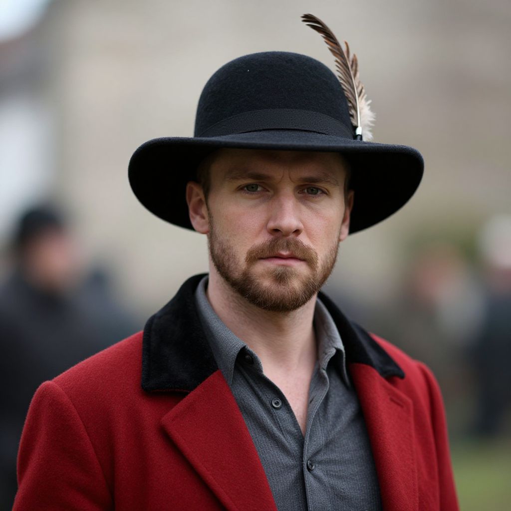 Highlander costume male, 1boy, male focus, solo, hat, blurry background, blurry, outdoors, facial hair, looking at viewer, upper body, shirt, hat feather, realistic, closed mouth, red jacket