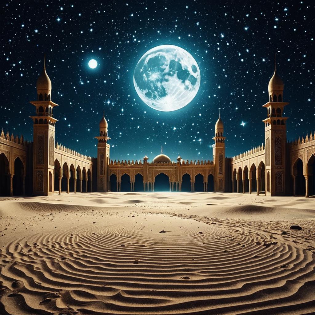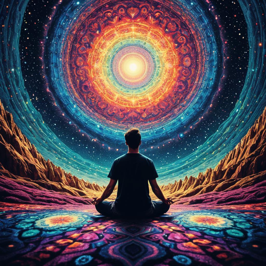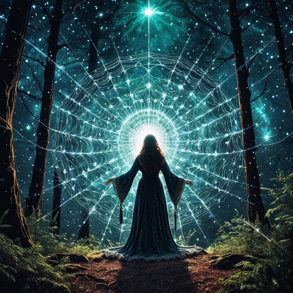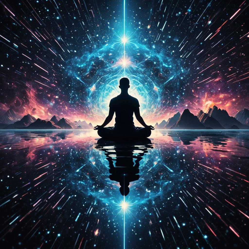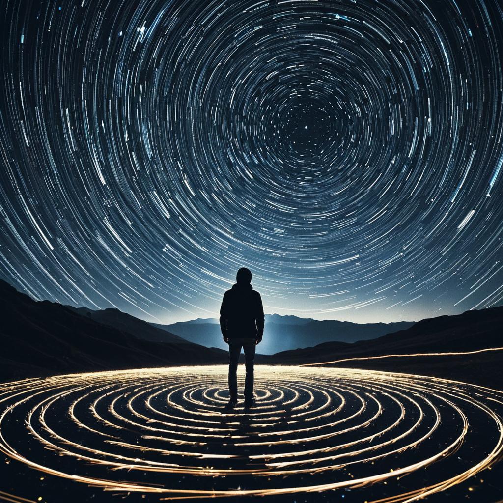 Silhouette of a lone figure standing in an illuminated spiral pattern on the ground, set against a stunning night sky filled with swirling star trails. The scene evokes an otherworldly and serene atmosphere with cosmic lights and a distant mountain horizon beneath a deep blue starry sky.