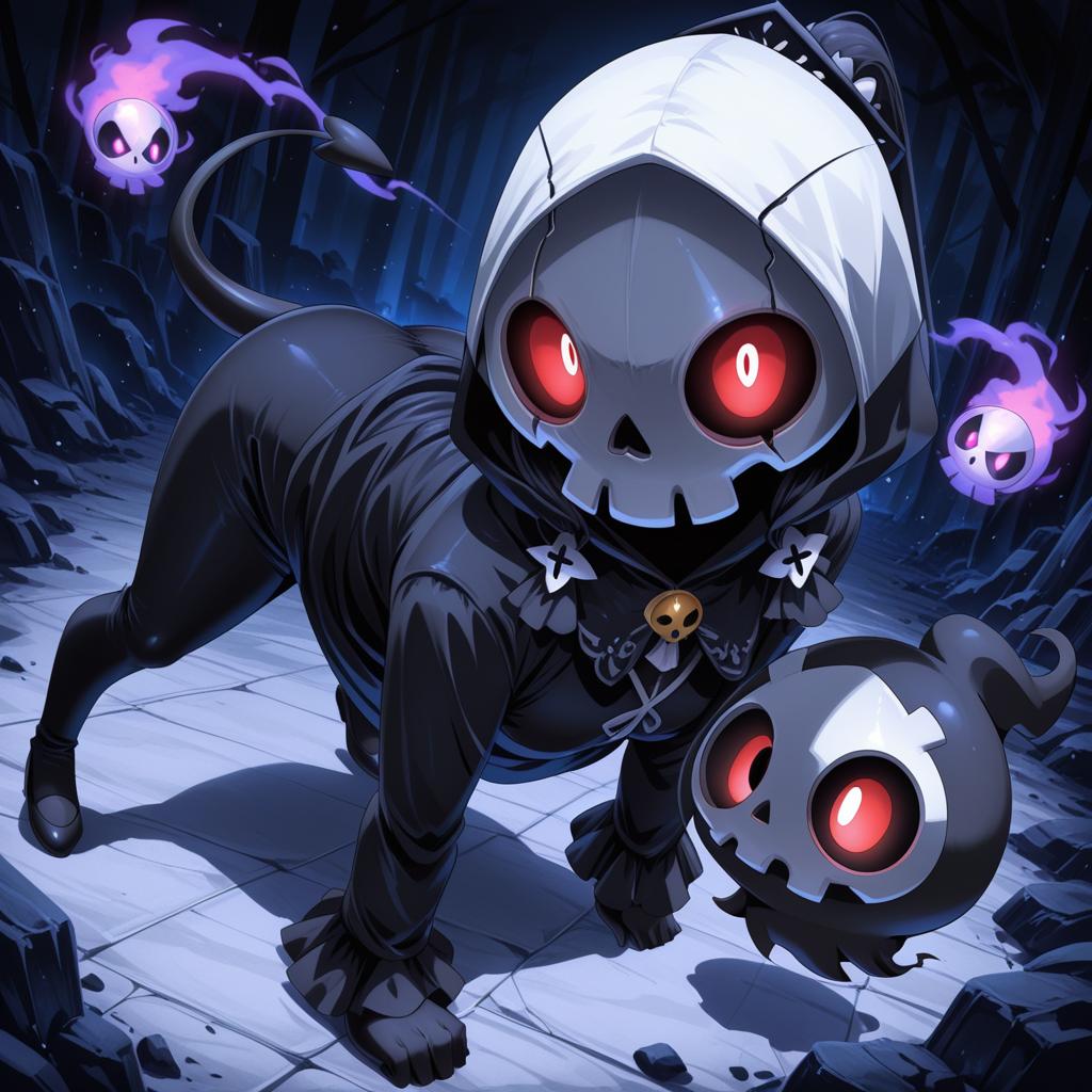 Digital illustration of Duskull, a ghost-type Pokemon, depicted with red glowing eyes and a skull-like face. The creature is wearing a black hooded outfit and is positioned on all fours in a dark, rocky forest path illuminated by faint blue light. Two smaller ghost-like spirits with skull faces and purple flames accompany the main figure. The scene evokes a mysterious and eerie atmosphere, characteristic of the ghost Pokemon theme.