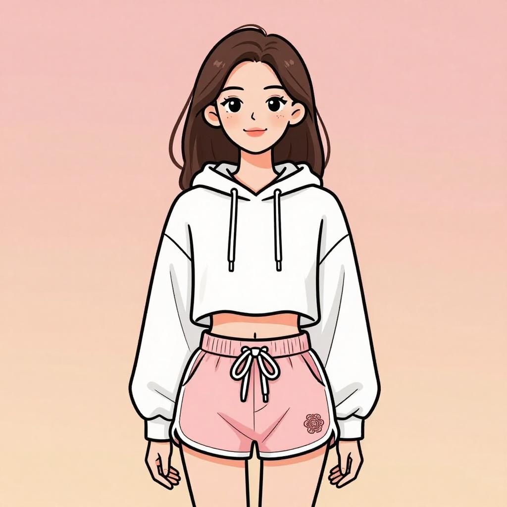 Woman with pretty face and pretty hair. smiling Woman, casual streetwear, cropped white hoodie with drawstring hood, long sleeves, raw hem, light pink shorts with white trim, elastic waistband, drawstring, embroidered emblem on the left leg, soft fabric, studio background with a warm peachy-pink gradient. --sref 1467