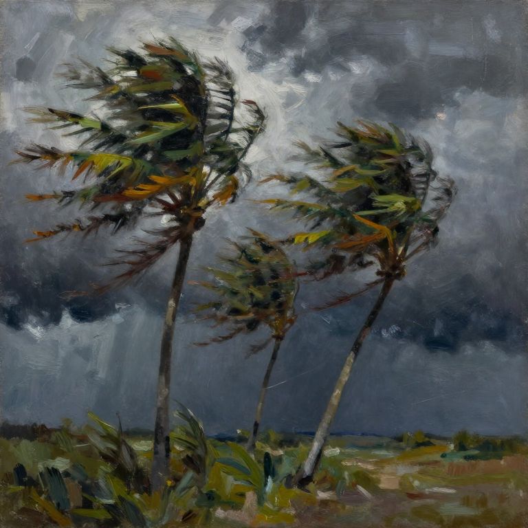 Palm trees painting depicting a stormy scene, dark clouds gathering above, twisting palms bending in strong wind, dynamic brushwork showing movement and tension, dramatic use of contrast and color, expressionist art capturing nature’s power.